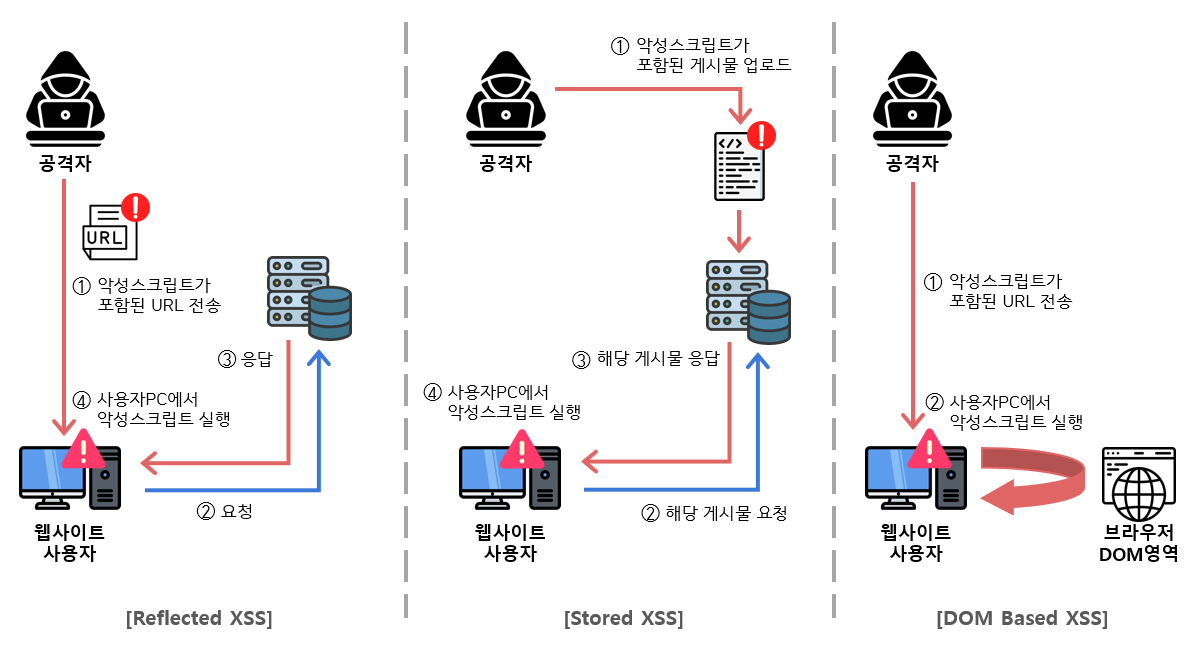 이때, 요청에 악성 스크립트가 포함된 경우, 해당 스크립트가 반영된 웹 페이지 반환