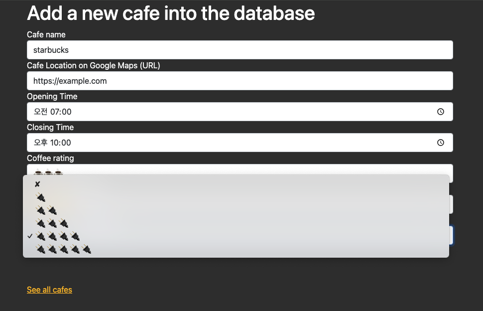 - cafes.html ํ์ผ์ cafe-data.csv์ ๋ชจ๋ ๋ฐ์ดํฐ๋ฅผ ํ์ํ๋ ๋ถํธ์คํธ๋ฉ ํ๋ฅผ ํฌํจ