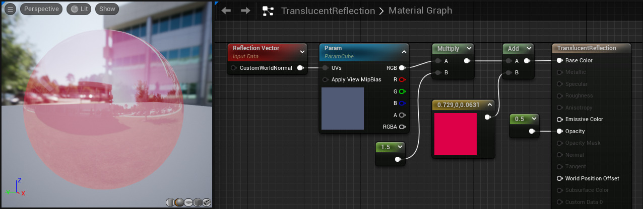 이 프로퍼티들은 메인 메테리얼 노드에서 어떤 입력이 활성화되는지 결정한다. 불투명(Opaque)은 Opacity입력이 비활성화되지만, 반투명(Translucent)를 선택하면 오파시티 입력이 활성화되고, 다른 활성화 입력 중 일부가 비활성화된다.