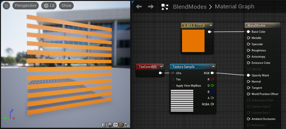 BlendMode는 이 메테리얼을 다른 픽셀 앞에 렌더링할 때, 엔진에서 이 메테리얼(소스컬러)과 프레임 버터에 있는 것(대상 컬러)을 결합하는 방식을 조절한다.