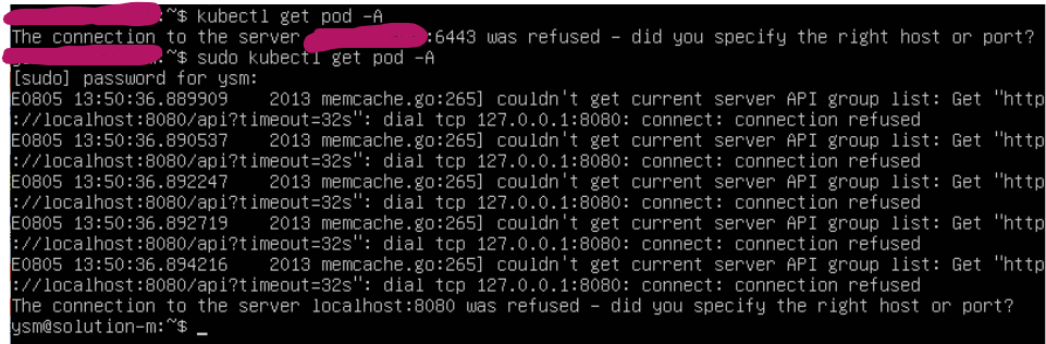 sudo으로 다시 수행해보았는데 couldn't get current server API group list 에러가 나서