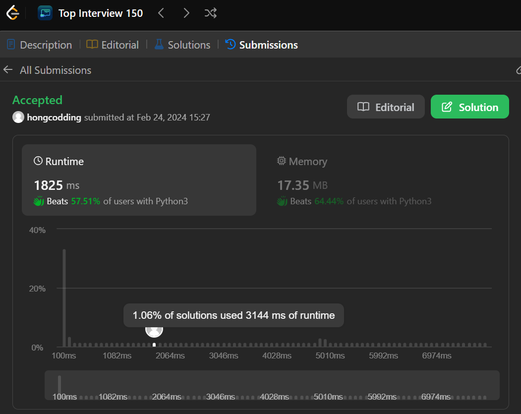 위와 같이 통과는 하지만 상당히 긴 실행시간을 소요하기 때문에 정렬이 아닌 다른 방법을 사용한 풀이를 생각해보자