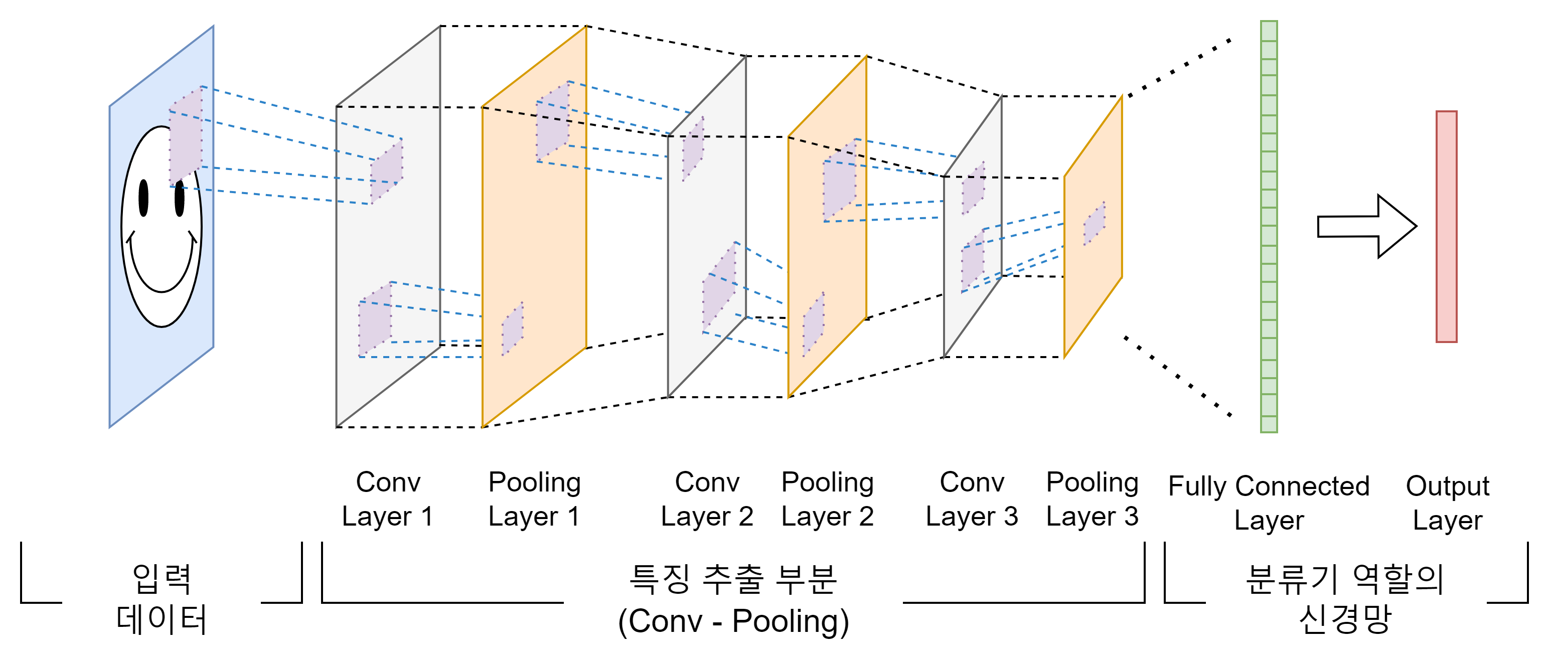 CNN은 여러 계층(layer)으로 구성되며, 주요 계층은 합성곱 계층(Convolutional Layer), 풀링 계층(Pooling Layer), 완전 연결 계층(Fully Connected Layer) 등이 있다. 이 계층들은 이미지의 특징을 추출하고, 이를 바탕으로 분류나 인식을 수행한다.