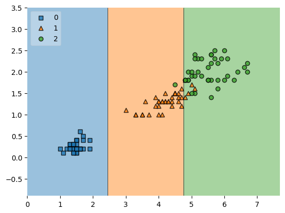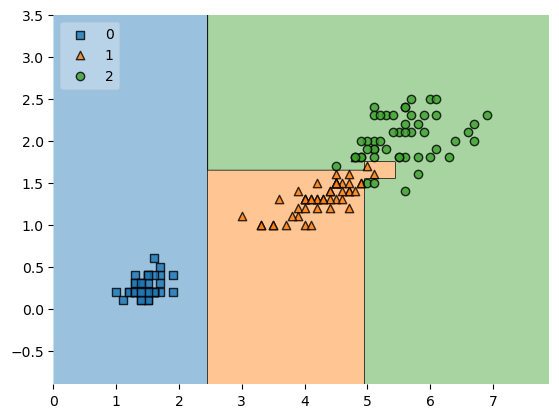 plot_decision_regions(X=iris.data[:,2:], y=iris.target, clf=iris_tree, legend=2)