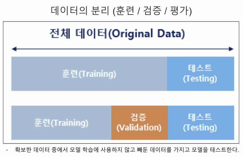 가지고 있는 데이터를 분리하여(ex. 훈련 80%, 테스트 20%) 한쪽은 학습, 나머지는 검증 진행