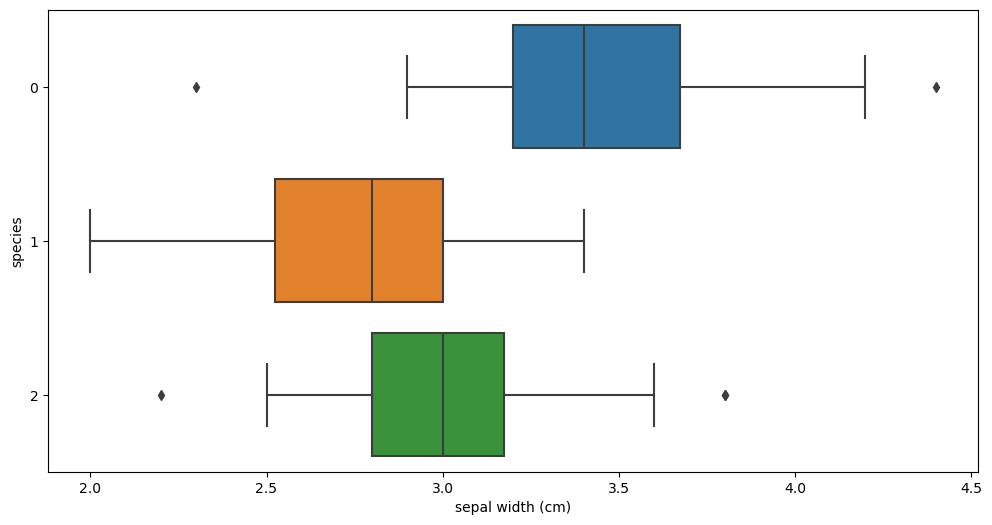 sns.boxplot(x= 'sepal width (cm)', y='species', data= iris_pd, orient='h');