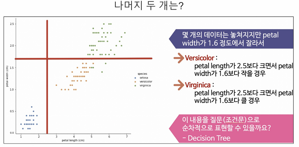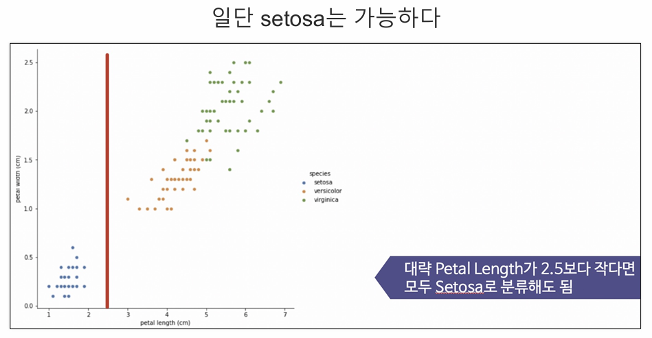📌 0번 품종은 구분 가능(petal length가 2.5보다 작으면 setosa)