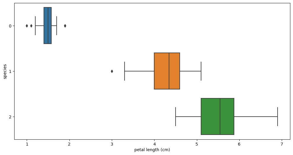 sns.boxplot(x= 'sepal length (cm)', y='species', data= iris_pd, orient='h');