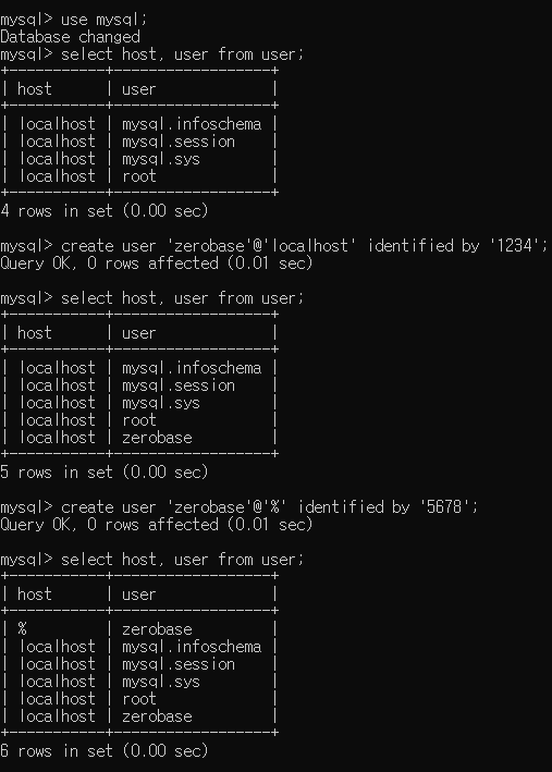 create user 'zerobase(유저이름)'@'% identified by '5678(비밀번호)';
