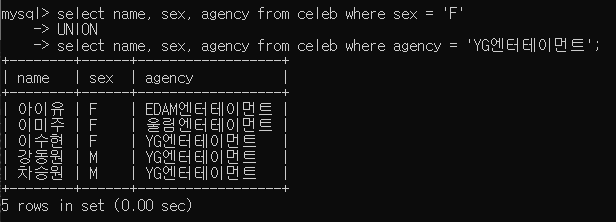 예제2 UNION: '이수현' 값이 한 번만 나타난 모습