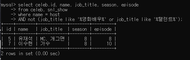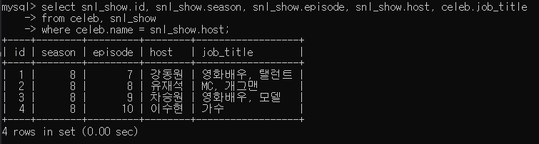 - step2: celeb 테이블 중 snl_show에 host로 출연한 사람 검색