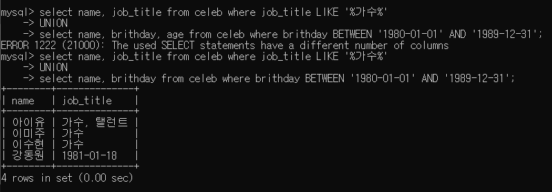 - 첫번째 UNION이 에러가 난 건 열의 갯수가 다르기 때문