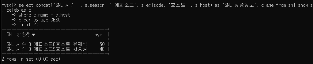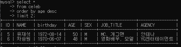예제2: snl에 출연한 연예인의 정보를 나이순으로 2개만 검색