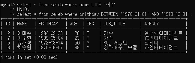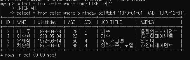 : 성이 이씨인 데이터를 검색하는 쿼리와 1970년대생을 검색하는 쿼리를