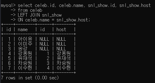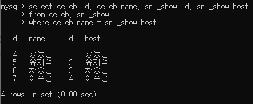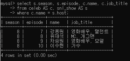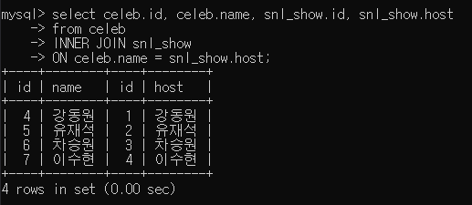 -예제: snl_show에 호스트에 출연한 celeb을 기준으로 celeb 테이블과 snl_show 테이블을 inner join 하기