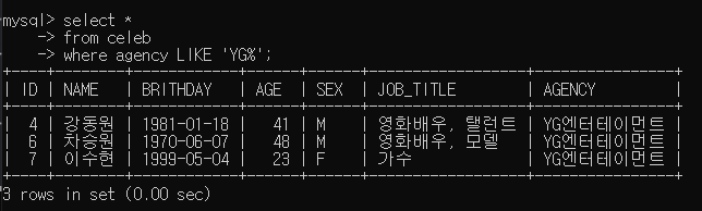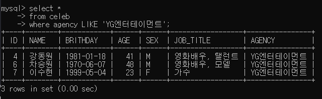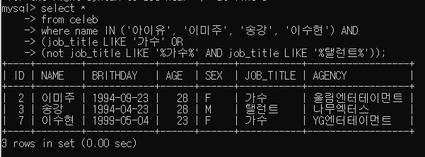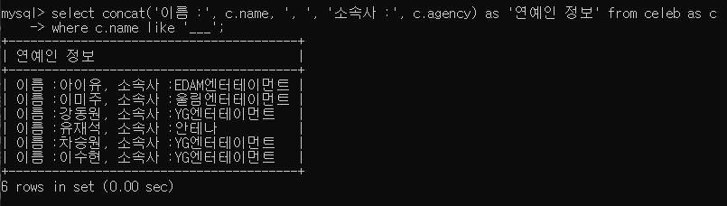 문제1: 이름이 3글자인 연예인 정보 다음과 같이 검색