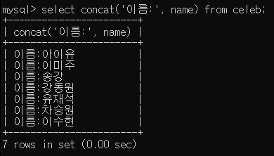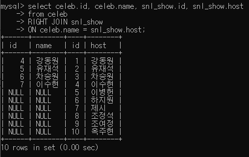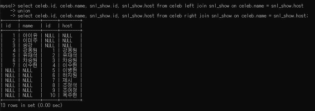 예제5: snl_show에 출연한 celeb을 기준으로 두 테이블을 조인하여 다음과 같이 별칭을 사용하여 검색