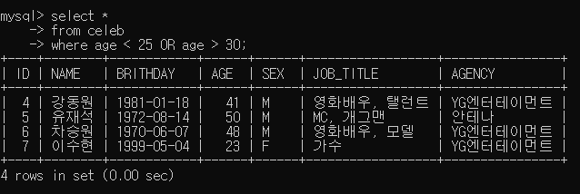 ex. 나이가 25세보다 작거나, 30세보다 큰 데이터 검색