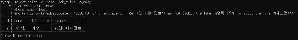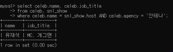 예제2: celeb 테이블의 연예인 중, snl_show 에 host로 출연했고, 소속사가 안테나인 사람의 이름과 직업을 검색