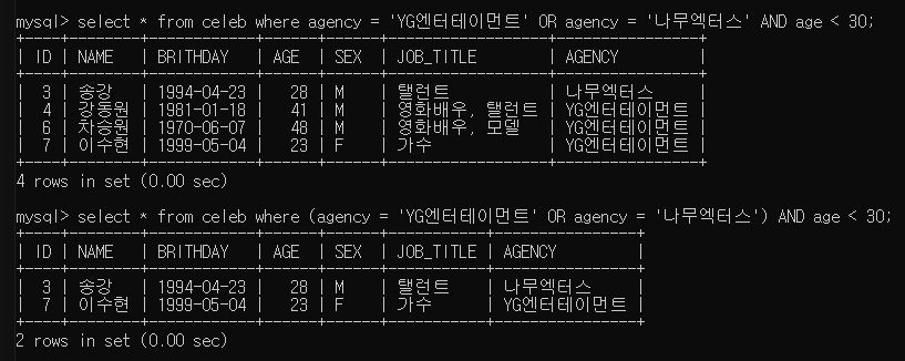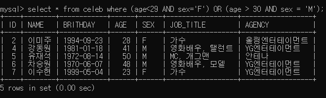 ex. 나이가 29세보다 작고 여자이거나, 나이가 30세보다 크고 남자인 데이터 검색