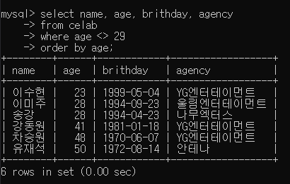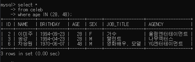 - where age = 28 or age = 48 이라고 써도 결과값 같음!