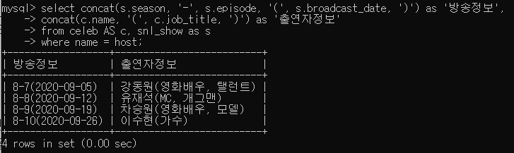 : select concat(s.season, '-', s.episode, '(', s.broadcast_date, ')') as '방송정보',