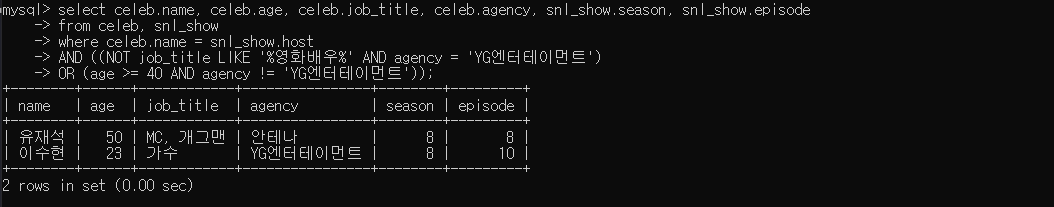 예제3: celeb 테이블의 연예인 중, snl_show에 host로 출연했고, 영화배우는 아니면서 YG엔터테이먼트 소속이거나, 40세 이상이면서 YG엔터테이먼트 소속이 아닌 연예인의 나이, 직업, 소속사, 시즌, 에피소드 정보를 검색