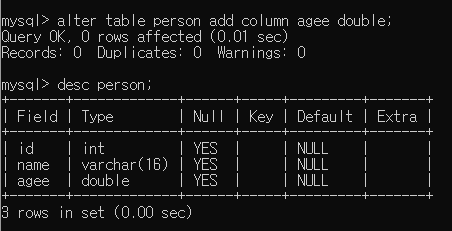 alter table person(테이블) add column agee(열) double(열 형태/double, int 등)