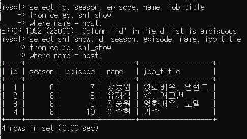 예제1: snl_show 호스트로 출연한 celeb을 기준으로 celeb 테이블과 snl_show 테이블을 self join