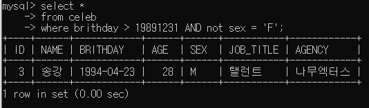 ex. 생일이 1990년 이후이면서 여자가 아닌 데이터