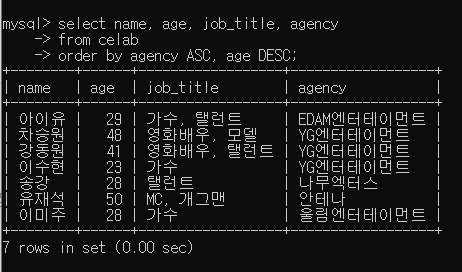 예제2: name은 이름으로, agency는 소속사로 별칭을 만들어 검색