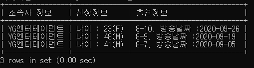 : select agency as '소속사 정보',concat('나이 : ', c.age, '(', c.sex, ')') as '신상정보',concat(s.season, '-', s.episode, ', ', '방송날짜 :', s.broadcast_date)as '출연정보'