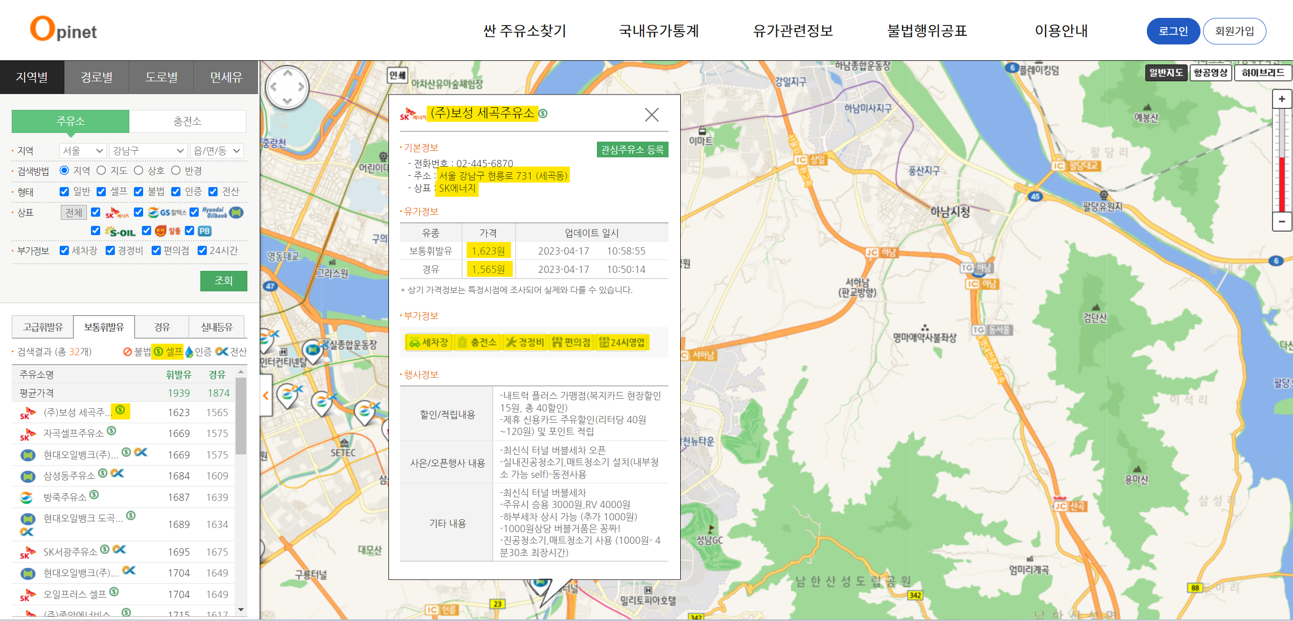 1) 오피넷에서 서울시 구별 주유소 데이터를 부가정보를 포함해 크롤링 코드로 수집할 것