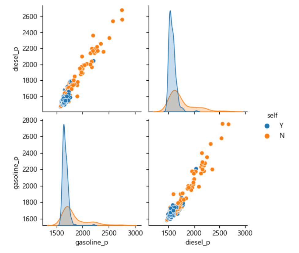 → 셀프주유소가 일반주유소보다 저가인 구간이 많이 보이나, 고가 구간 또한 많이 보인다.