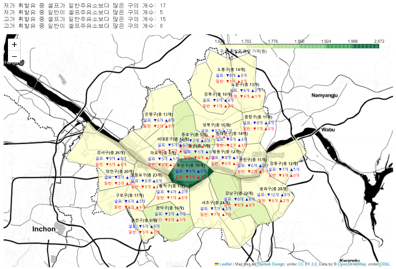 → 지도에 나타난 바탕색은 각 구의 평균 휘발유 가격에 따른 차이이며, 평균 가격이 높아 색이 진하게 표시된 구는 용산구, 강남구, 관악구, 중구, 종로구이다. 해당 구들은 대체적으로 셀프주유소보다 일반주유소가 많고, 나머지 구들은 대체적으로 셀프주유소가 일반주유소보다 많다.