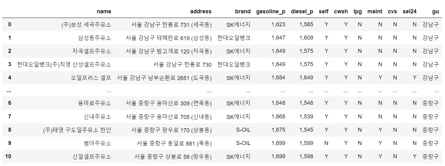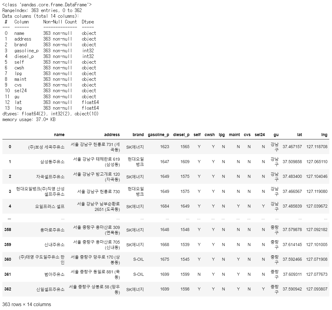 3) 컬럼명은 영문으로 저장 ['name', 'address', 'brand', 'gasoline_p', 'diesel_p', 'self', 'cwsh', 'lpg', 'maint', 'cvs', 'sel24', 'gu', 'lat', 'lng']