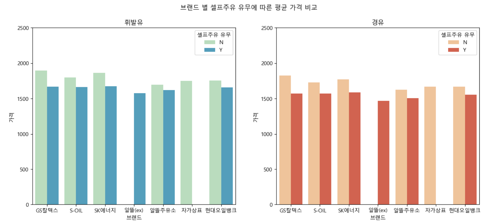 - 브랜드 별로 휘발유와 경유의 평균값을 비교했을 때도 마찬가지로 셀프주유소가 더 저렴하다는 결과가 나왔다.