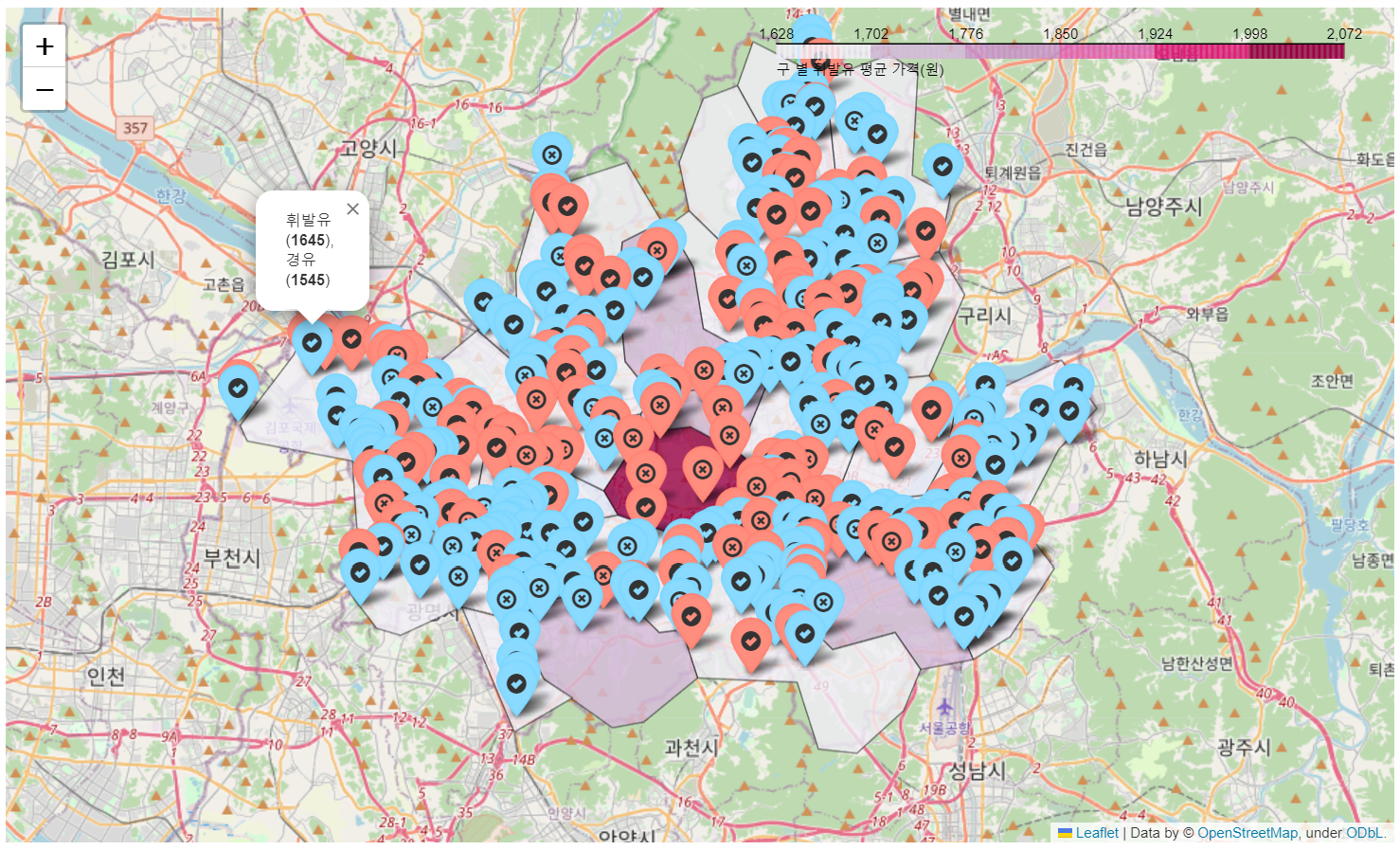 - 구 별 휘발유 가격의 평균을 Choropleth로 표현 & 평균값 편차에 따른 마커 표시