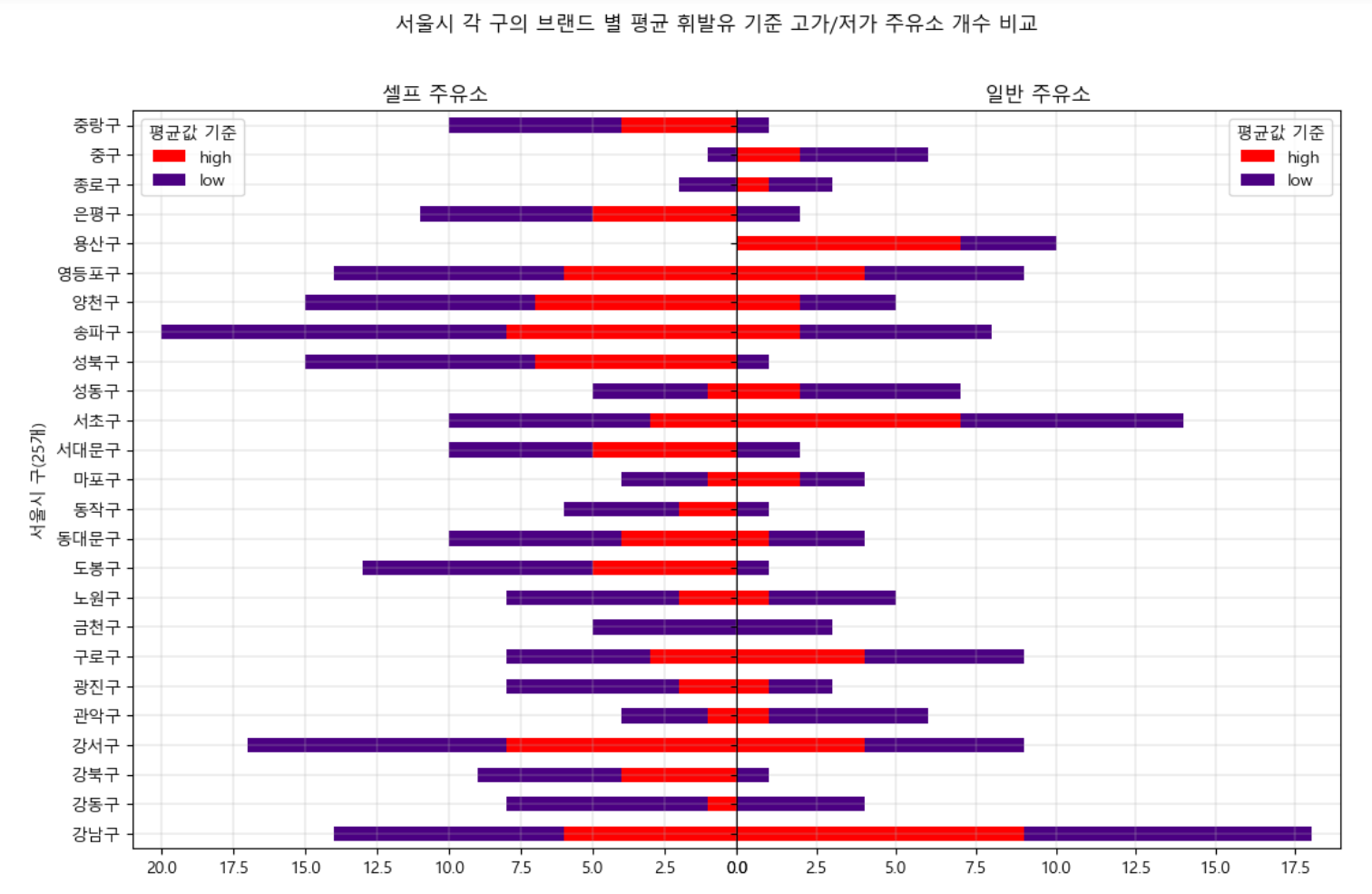- 서울시 각 구의 브랜드 별 평균 휘발유 기준 고가/저가 주유소 개수 비교
