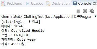 Clothing clothing1 = new Clothing(2024, "Oversized Hoodie", "UNIQLUX", "Outerwear", 49900);
