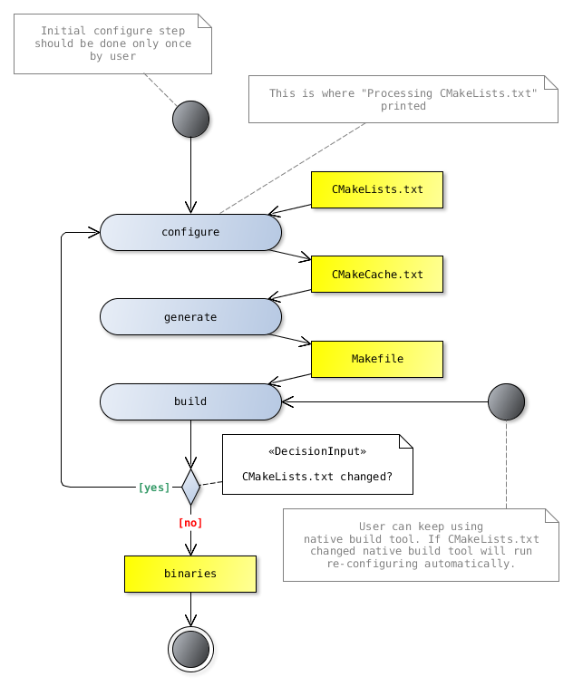 CMake를 사용하는 모든 프로젝트에는 반드시 프로젝트 최상위 디렉토리에 CMakeLists.txt 파일이 있어야 한다. 해당 파일에는 CMake가 빌드 파일을 생성하는데 필요한 정보들이 들어 있다. 따라서 보통의 컴파일 과정은 다음과 같이 진행된다.