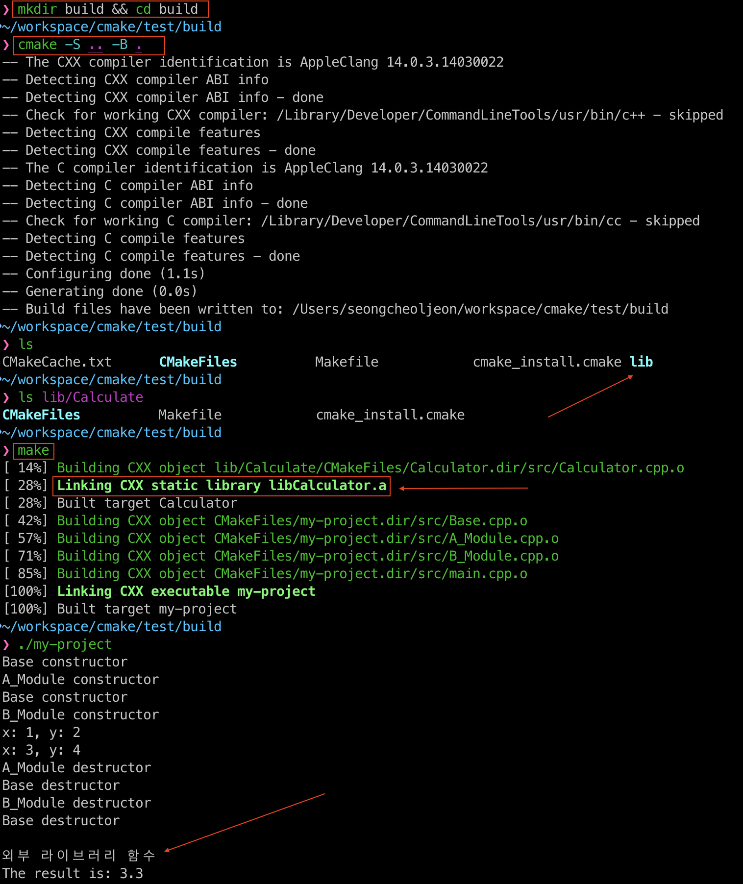 위의 그림처럼 Linking CXX static library libCaculator.a 라는 문구가 나오며 잘 실행된 것을 볼 수 있다.