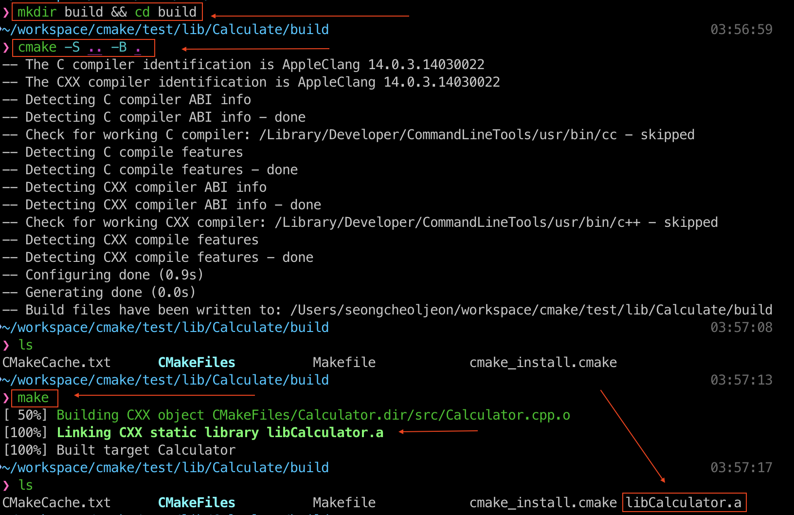 실제로 build 디렉토리를 확인해보면, libCalculator.a 파일이 생긴 것을 볼 수 있다. 참고로 CMake는 라이브러리를 만들게 되면, 앞에 lib를 붙인 라이브러리 파일을 생성한다.
