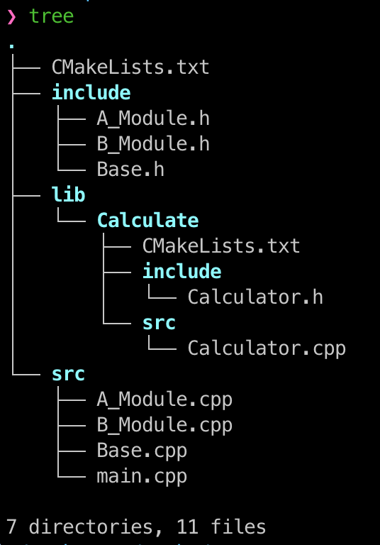 타겟(target)에만 헤더 디렉토리를 적용타겟(target)에만 영향을 미치므로 더 명시적이고 권장되는 방식이다.target_include_directories(my_target PUBLIC ${CMAKE_SOURCE_DIR}/include)my_target 타겟에만 해당 디렉토리가 포함된다.target_include_directories는 접근 제어(PRIVATE, PUBLIC, INTERFACE) 옵션을 제공하여 헤더 디렉토리의 가시성을 제어할 수 있다.PRIVATEPUBLICINTERFACEPRIVATEPRIVATE로 지정된 컴파일 옵션은 해당 타겟에만 적용되고, 이 타겟을 의존하는 다른 타겟에는 전파되지 않는다.PUBLIC다른 타겟에도 적용. 즉, PUBLIC으로 지정된 옵션은 해당 타겟뿐만 아니라, 이 타겟을 의존하는 다른 타겟에도 동일하게 적용된다.INTERFACEINTERFACE로 지정된 옵션은 해당 타겟 자체에는 적용되지 않고, 오직 이 타겟을 의존하는 타겟에만 적용된다.링킹(Linking)의 형태를 명시하지 않는다면, 여기서 생성되는 라이브러리는 프로젝트 생성 시, BUILD_SHARED_LIBS 변수에 따라서 결정된다.CMakeLists.txt 파일이 존재해야 한다)make all 명령어를 실행할 때, 해당 디렉토리의 target을 제외 함CMakeLists.txt파일을 호출하고 빌드 시스템에 통합할 때 사용add_subdirectory는 디렉토리마다 독립적인 CMakeLists.txt 파일을 정의하고, 이를 상위 프로젝트에서 통합할 때 사용make install 실행 시, 동작 지정링크할 때 사용Makefile로 작성했던 것을 CMakeLists.txt 파일로 다시 작성해보자. 파일 구조는 다음과 같다.