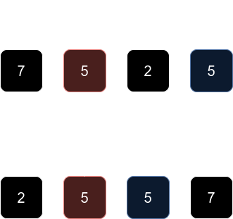 예를 들어 숫자를 기준으로 정렬한다고 생각해보자. 다음 그림에서 붉은색 5와 푸른색 5의 카드 순서가 정렬 후에도 유지되므로 안정 정렬이다.