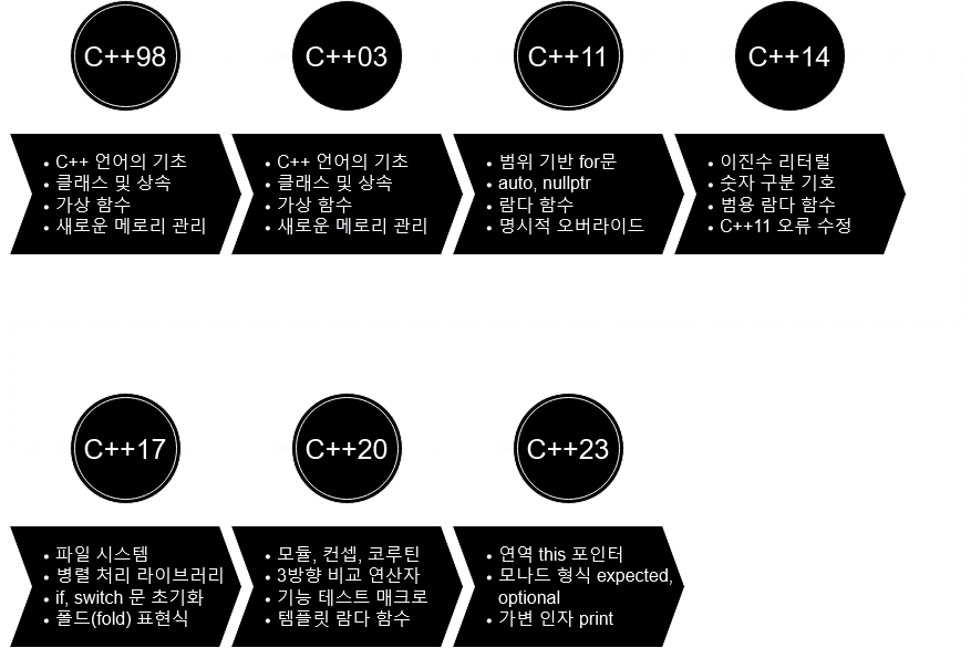 모던 C++ 버전별로 어떠한 변화가 있었는지 살펴보자.