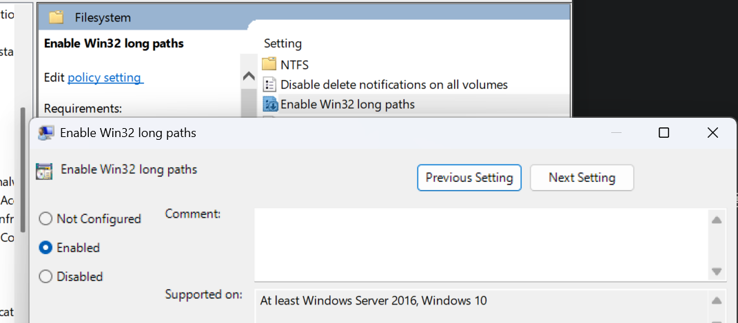그 후 Computer Configuration - Administrative Templates - System - Filesystem - Enable Win32 long paths의 속성을 Enabled로 변경한다.