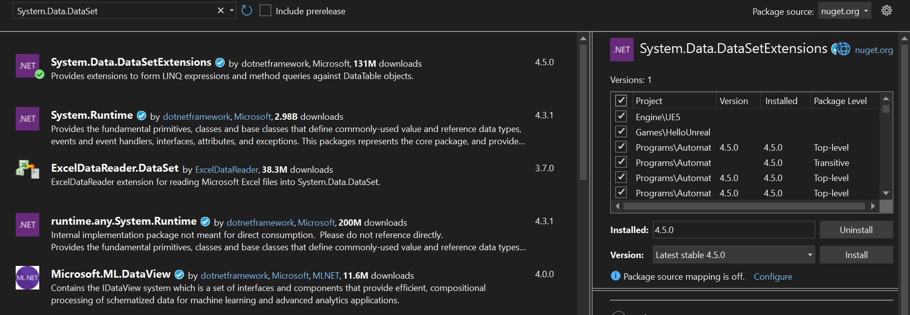 Visual Studio 2022 - Tools - NuGet Package Manager - Manage Packages for Solution... 을 클릭한다. 그 후, 검색창에 System.Data.DataSetExtensions를 입력하여 나오는 모든 패키지를 설치한다. (아래 사진 참고)