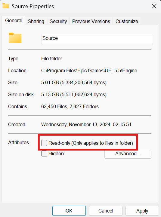 C:\Program Files\Epic Games\UE_5.5\Engine\Source 해당 경로의 폴더의 읽기 전용을 해제하자.